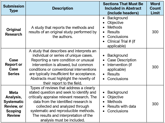 Submitted abstracts must follow a structured abstract format. Please follow guidelines below when submitting your abstract.